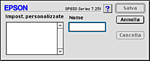 Digitare un nome univoco (fino a 16 caratteri) per le Impost. personalizzate nella casella di testo Nome, quindi fare clic su Salva. Le altre impostazioni verranno aggiunte all'elenco Impostazioni personalizzate. È possibile salvare fino a 100 Impost. personalizzate diverse.