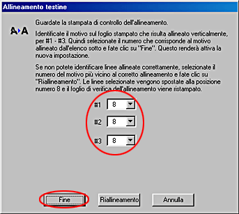Per ciascun motivo sulla pagina del test di stampa, scegliere la linea verticale che appare con il miglior allineamento. Per ciascuno di questi motivi, selezionare il numero della linea corrispondente dal relativo elenco a discesa nella finestra di dialogo Allineamento testine, quindi fare clic su Fine per rendere effettive le nuove impostazioni.