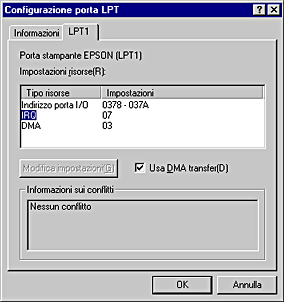 Se la stampante è collegata alle porte LPT2 o LPT3, l'impostazione delle risorse IRQ e DMA può velocizzare la stampa. Fare clic su Cambia impostazione ed inserire gli stessi numeri di configurazione relativi alle risorse IRQ e DMA eseguiti con la scheda di espansione. Per determinare le impostazioni delle risorse IRQ e DMA, consultare la documentazione del computer.
