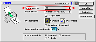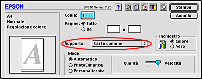 Nella finestra di dialogo Stampa (Macintosh), selezionare il Supporto desiderato; quindi, selezionare l'impostazione del formato carta desiderato nella finestra di dialogo Formato di Stampa.