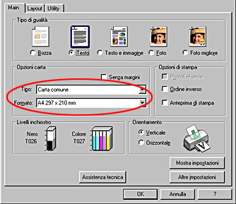 Nel menu Principale (Windows), selezionare il Formato ed il Tipo desiderato in Opzioni carta.