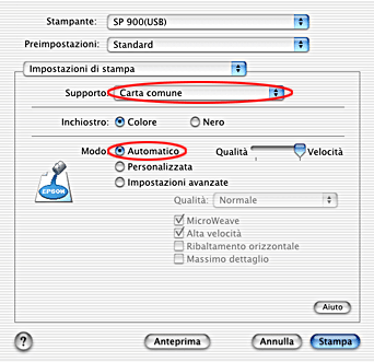 Selezionare Carta comune come impostazione di Supporto e Automatico come impostazione di Modo.