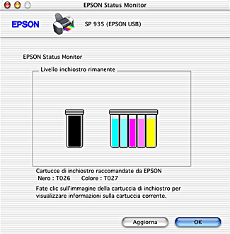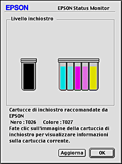 L'immagine grafica visualizza la quantità di inchiostro rimanente al momento dell'apertura di EPSON StatusMonitor. Per aggiornare le informazioni sul livello di inchiostro, fare clic su Aggiorna.