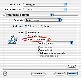 Se si seleziona Personalizzata viene abilitato l'elenco Impostazioni personalizzate, dal quale è possibile scegliere un'impostazione già predisposta studiata per la stampa di testo e grafici. Oppure, è possibile selezionare ColorSync, un metodo di corrispondenza dei colori. È possibile inoltre creare e salvare proprie impostazioni personalizzate. Per ulteriori informazioni sulla creazione di impostazioni personalizzate, vedere Uso del modo Impostazioni avanzate.