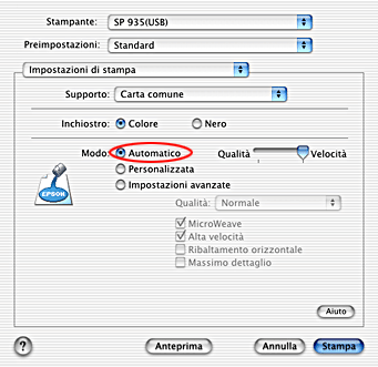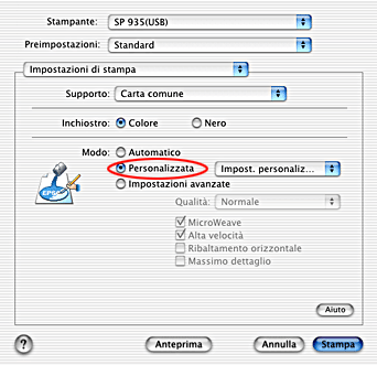 Questo modo consente di scegliere da un elenco di impostazioni già predisposte o personalizzate adatte al tipo di documento da stampare. Per informazioni dettagliate, vedere Uso del modo Personalizzata. |