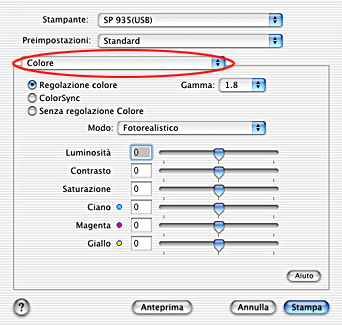 Selezionare Colore dal menu a comparsa per controllare i metodi di regolazione e di corrispondenza del colore forniti con il driver della stampante. Seguire le istruzioni sotto riportate: