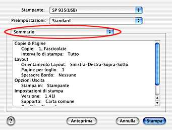 Tramite la selezione di Sommario, è possibile verificare le impostazioni correnti nella finestra di dialogo Stampa.