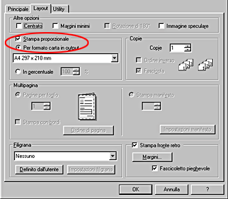 Selezionare la casella di controllo Stampa proporzionale nel menu Layout, quindi selezionare Per formato carta in output.