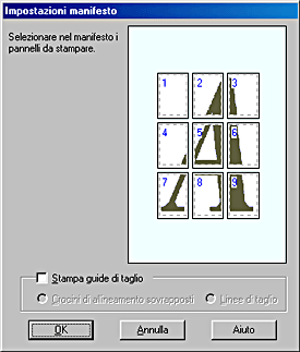 Se si desidera stampare soltanto alcuni pannelli senza stampare l'intero manifesto, fare clic su Seleziona stampa fogli, quindi fare clic sui pannelli da non stampare e infine fare clic su OK.