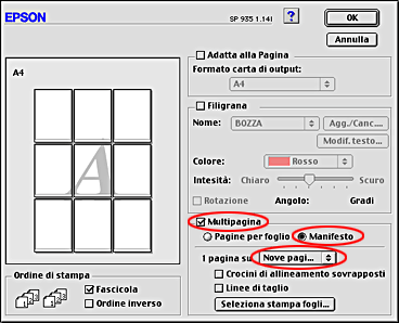 Specifica il numero di fogli stampati di carta che dovrà occupare la pagina ingrandita del documento. È possibile selezionare 4, 9 o 16 pagine.