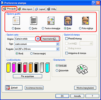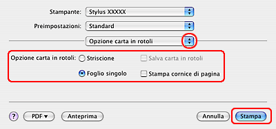 ![]() Selezionare Modalità foglio singolo per stampare foto di formato standard. Selezionare Modalità carta in rotolo per stampare striscioni.