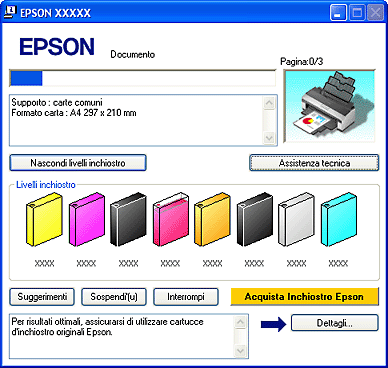 Epson non garantisce la qualità o l’affidabilità di inchiostri non originali. Se vengono installate cartucce d'inchiostro non originali, lo stato della cartuccia potrebbe non essere visualizzato.
