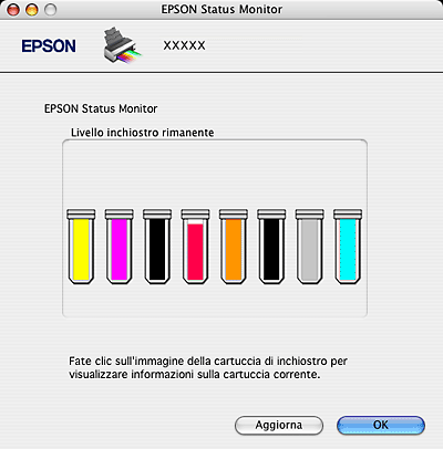 La grafica visualizza lo stato della cartuccia d'inchiostro al momento dell'apertura iniziale di EPSON StatusMonitor. Per aggiornare lo stato della cartuccia d'inchiostro, fare clic su Aggiorna.
