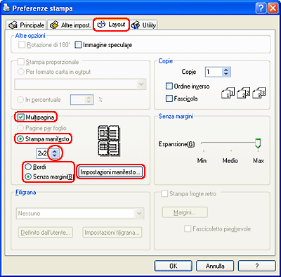 La funzione Stampa manifesto consente di stampare immagini di formato manifesto; a tal fine, una pagina viene ingrandita per coprire un certo numero di fogli.