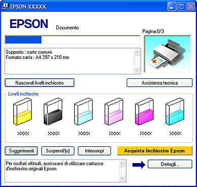 La barra di avanzamento viene automaticamente visualizzata quando si avvia un lavoro di stampa. Da questa finestra è possibile controllare lo stato della cartuccia d'inchiostro. Fare clic sul pulsante Verifica livelli inchiostro nella schermata della barra di avanzamento per visualizzare lo stato della cartuccia di inchiostro, come mostrato sotto.