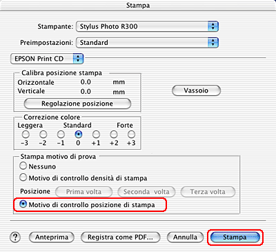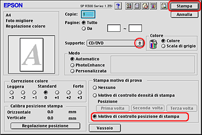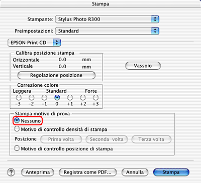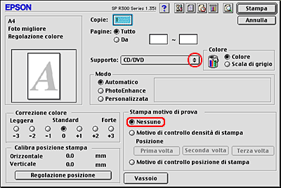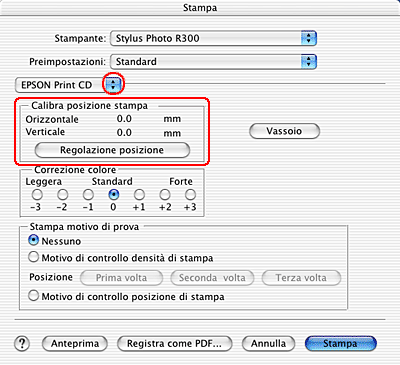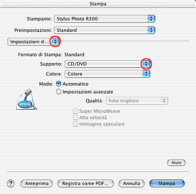 Selezionare Stylus Photo R300 come impostazione di Stampante. Scegliere Impostazioni di stampa dal menu a comparsa. Selezionare CD/DVD come impostazione di Supporto.