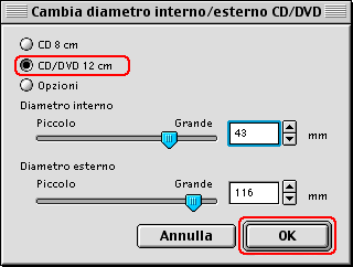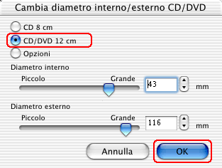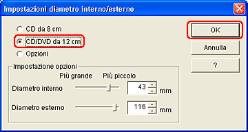 Scegliere Cambia diametro interno/esterno CD/DVD dal menu Archivio. Viene visualizzata la finestra di dialogo Cambia diametro interno/esterno CD/DVD.