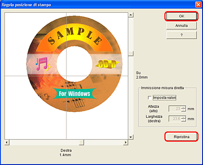 È possibile regolare manualmente la posizione di stampa senza stampare il motivo di controllo. Aprire la finestra di dialogo Regola posizione stampa. Assicurarsi che la casella di controllo Immetti valori non sia selezionata, quindi trascinare l'immagine di etichetta di esempio o utilizzare la barra di scorrimento per regolare le impostazioni per Larghezza (Destra) e Altezza (Alto), infine fare clic su OK.