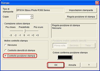 Selezionare Motivo controllo posizione stampa nel riquadro Motivo controllo stampa, quindi fare clic su OK.