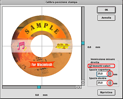 È possibile regolare manualmente la posizione di stampa senza stampare il motivo di controllo. Aprire la finestra di dialogo Calibra posizione stampa. Assicurarsi che la casella di controllo Immetti valori non sia selezionata, quindi trascinare l'immagine di etichetta di esempio o utilizzare la barra di scorrimento per regolare le impostazioni per Spazio superiore e Spazio destro, infine fare clic su OK.