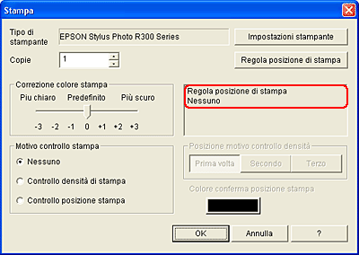 Se non è selezionata l'impostazione EPSON Stylus Photo R300 Series, premere il pulsante Impostazioni stampante e selezionare il nome della stampante appropriata nella finestra di dialogo Impostazioni stampante, quindi premere OK.