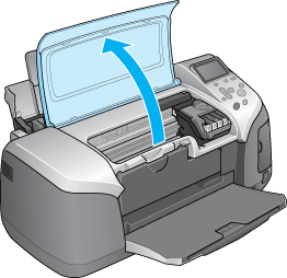 Aprire il coperchio della stampante e quindi abbassare la guida CD/DVD.