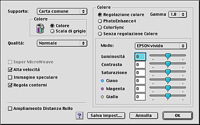 EPSON Vivid: In base ai dati, aumenta il bilanciamento del colore per risultati di stampa ottimali. Questa impostazione è consigliata per la maggior parte dei lavori. EPSON Standard: Fornisce risultati che corrispondono accuratamente ai dati originali. Grafici e diagrammi: Intensifica i colori e riduce i mezzi toni mettendo in risalto l'immagine. Utilizzare questa impostazione per la presentazione delle immagini, quali diagrammi e grafici. |