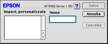 Digitare un nome univoco per le impostazioni nella casella di testo Nome, quindi fare clic su Salva. Il nome può contenere un numero massimo di 16 lettere e numeri. È inoltre possibile utilizzare fino a 8 caratteri a doppio byte; tuttavia, a seconda del sistema operativo in uso, tali caratteri potrebbero non venire visualizzati in modo corretto. L'impostazione personalizzata effettuata verrà aggiunta all'elenco Impostazioni personalizzate e verrà selezionata l'ultima impostazione. È possibile salvare fino a 100 impostazioni personalizzate.