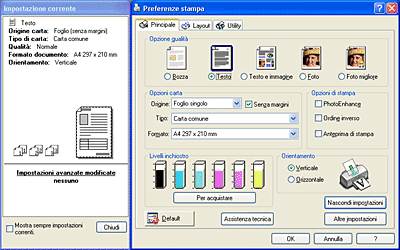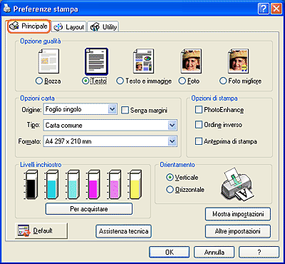 Nel menu Principale è possibile eseguire le impostazioni di Opzioni di qualità, Opzioni carta, Opzioni di stampa, Orientamento, Altre impostazioni e controllare i livelli di inchiostro. Fare riferimento alla sezione appropriata riportata di seguito.