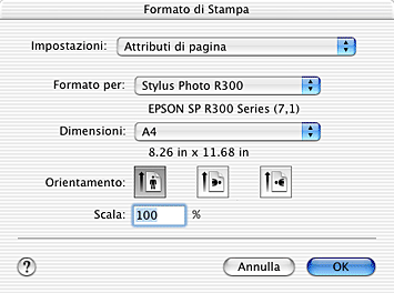 Accendere la stampante, aprire la cartella Applicazioni sul disco rigido, quindi aprire la cartella Utility e fare doppio clic sull'icona Centro Stampa. Fare clic sull'icona Aggiungi (per Mac OS X 10.1.x, fare clic su Aggiungi stampante) nella finestra di dialogo dell'elenco delle stampanti e selezionare EPSON USB dal menu a comparsa. Selezionare Stylus Photo R300 dall'elenco dei prodotti, quindi selezionare Alimentatore - Margini zero dal menu a comparsa Formato di Stampa. Fare clic su Aggiungi, quindi verificare che Stylus Photo R300 (Alimentatore - Margini zero) sia visualizzato nella finestra di dialogo dell'elenco delle stampanti. Chiudere la finestra di dialogo dell'elenco delle stampanti.