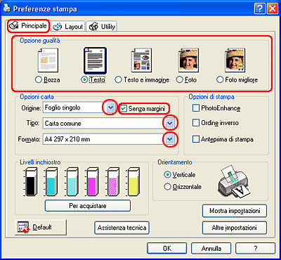 Dopo aver caricato il supporto, modificare le impostazioni del driver della stampante selezionando la stampa senza margini.