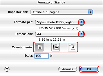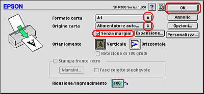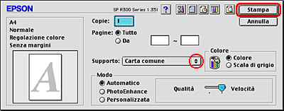 Selezionare Stylus Photo R300 ( Alimentatore - Margini zero ) come impostazione di Formato per.