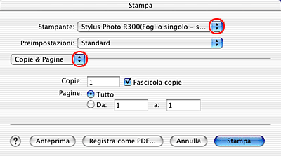 Selezionare Stylus Photo R300 ( Alimentatore - Margini zero ) come impostazione di Stampante, quindi effettuare le impostazioni di Copie & Pagine.