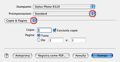 Far coincidere l'impostazione di Stampante con l'impostazione di Formato per effettuata nella finestra di dialogo Formato di Stampa al passaggio 3. Quindi, effettuare le impostazioni di Copie & Pagine.