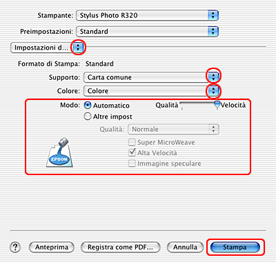 Effettuare le impostazioni appropriate di Supporto, Inchiostro e Modo.
