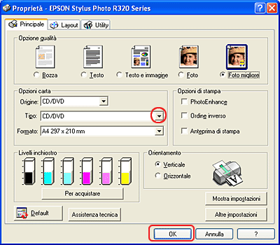 Selezionare CD/DVD o Superficie Premium CD/DVD come impostazione di Tipo.