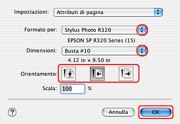 Selezionare il formato busta appropriato come impostazione di Dimensioni.