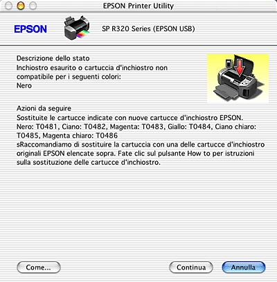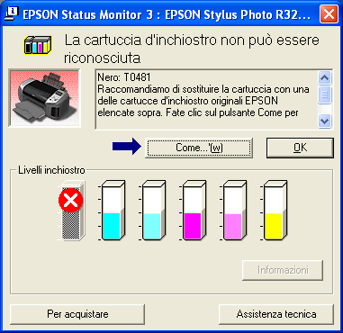 Quando l'inchiostro è scarso o esaurito, appare il pulsante Come.... Fare clic su Come... ed EPSON StatusMonitor guiderà l'utente nella procedura di sostituzione della cartuccia d'inchiostro.