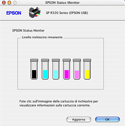 È possibile utilizzare questa utility per controllare i livelli di inchiostro prima della stampa. EPSON StatusMonitor visualizza la quantità di inchiostro rimanente al momento dell'apertura. Per aggiornare le informazioni sul livello di inchiostro, fare clic su Aggiorna.