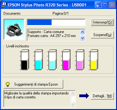 La finestra di dialogo della barra di avanzamento appare automaticamente quando si invia un lavoro di stampa alla stampante. Da questa finestra di dialogo è possibile controllare la quantità di inchiostro rimanente.