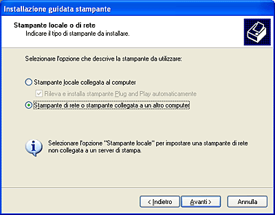Selezionare Stampante di rete o stampante collegata a un altro computer, quindi fare clic Avanti.
