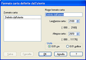 Selezionare Personalizzato come impostazione di Formato. Viene visualizzata la finestra di dialogo Formato carta definito dall'utente.