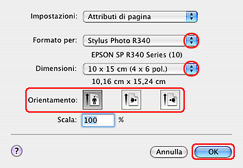 Definire le impostazioni appropriate di Dimensioni e Orientamento. È possibile inoltre definire un formato carta personalizzato. Per informazioni dettagliate, consultare la Guida in linea.