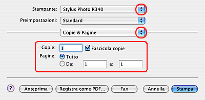 Definire l'impostazione di Stampante che corrisponde all'impostazione di Formato per selezionata nel passaggio 3. Quindi, definire le impostazioni di Copie & Pagine.