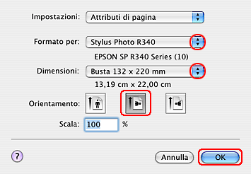 Selezionare il formato busta appropriato come impostazione di Dimensioni. È inoltre possibile definire un formato busta personalizzato. Per informazioni dettagliate, consultare la Guida in linea.
