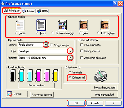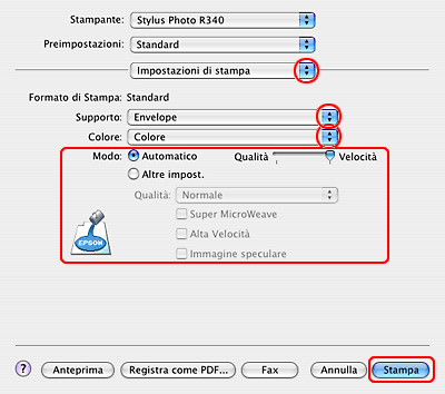 Selezionare Busta come impostazione di Supporto, quindi definire le impostazioni appropriate di Colore e Modo. Per informazioni dettagliate su Impostazioni di stampa, vedere la guida in linea.