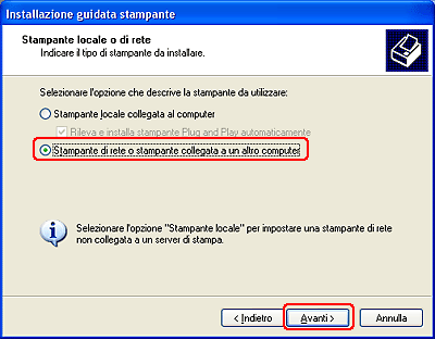 Selezionare Stampante di rete o stampante collegata a un altro computer, quindi fare clic su Avanti.