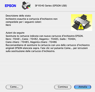 Quando l’inchiostro è scarso o esaurito, sotto la casella di testo viene visualizzato il pulsante Come.... Fare clic su Come... ed EPSON Status Monitor 3 guiderà l’utente nella procedura di sostituzione della cartuccia di inchiostro.