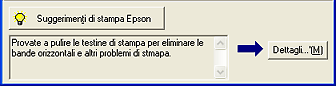 Nella casella di testo della parte inferiore della finestra della barra di avanzamento vengono visualizzati suggerimenti per sfruttare al meglio il driver della stampante Epson. Ogni 30 secondi viene visualizzato un nuovo suggerimento. Per informazioni dettagliate sul suggerimento visualizzato nella finestra, fare clic sul pulsante Dettagli.