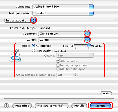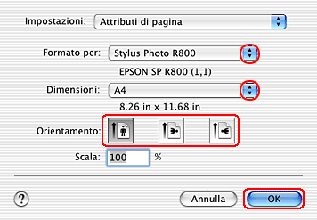 Effettuare l'impostazione appropriata di Formato per. Quando si stampa con i margini standard, selezionare Stylus Photo R800.